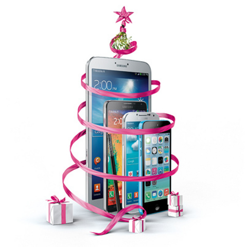 T-Mobile startet in die Weihnachtszeit und schenkt allen Kunden 200 Euro, die ein Apple iPhone 5c, Samsung Galaxy S4, Note 3 oder Tab 3 8.0 LTE in Kombination mit einem SMART NET UNLIMITED Tarif für Smartphones oder TAB NET Tarif für Tablets erstehen.