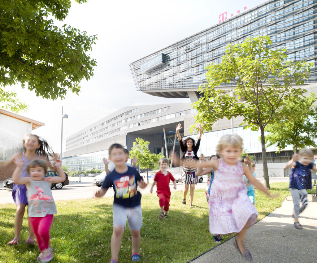 „T-Mobile war Pionier, als wir vor zehn Jahren einen Betriebskindergarten eingeführt haben. Der Betriebskindergarten bietet die Chance auf einen schnellen Wiedereinstieg ins Berufsleben. Das ist ein klarer Wettbewerbsvorteil für T-Mobile. Er bietet flexible Öffnungszeiten und hat auch zwischen den Weihnachtsfeiertagen und im Sommer geöffnet“, sagt Joachim Burger, HR Director T-Mobile. Den Betriebskindergarten besuchen Kinder von Mitarbeiterinnen und Mitarbeitern von T-Mobile und T-Systems.