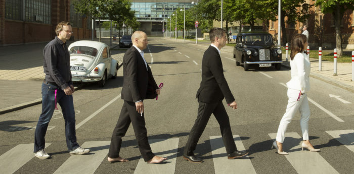 Das wohl berühmteste Bild der Beatles zeigt George Harrison, Paul McCartney, Ringo Starr und John Lennon, wie sie die EMI-Studios in London verlassen und den Zebrastreifen der Abbey Road queren. Als Cover von „Abbey Road“ ging das Foto um die Welt. Die T-Mobile Geschäftsleitung ging in der #AbbeyRoadChallenge voran und lies sich auf dem Zebrastreifen vor den Marx-Hallen und dem T-Center ablichten.